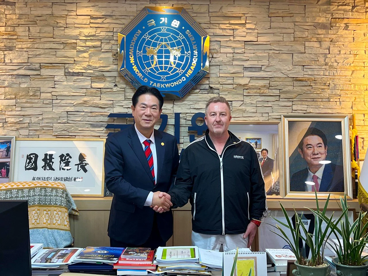 Below is Kukkiwon President, Grand Master Lee Dong-Sup, congratulating Grand Master Andrew at the Kukkiwon World Taekwondo Headquarters in May 2025.
